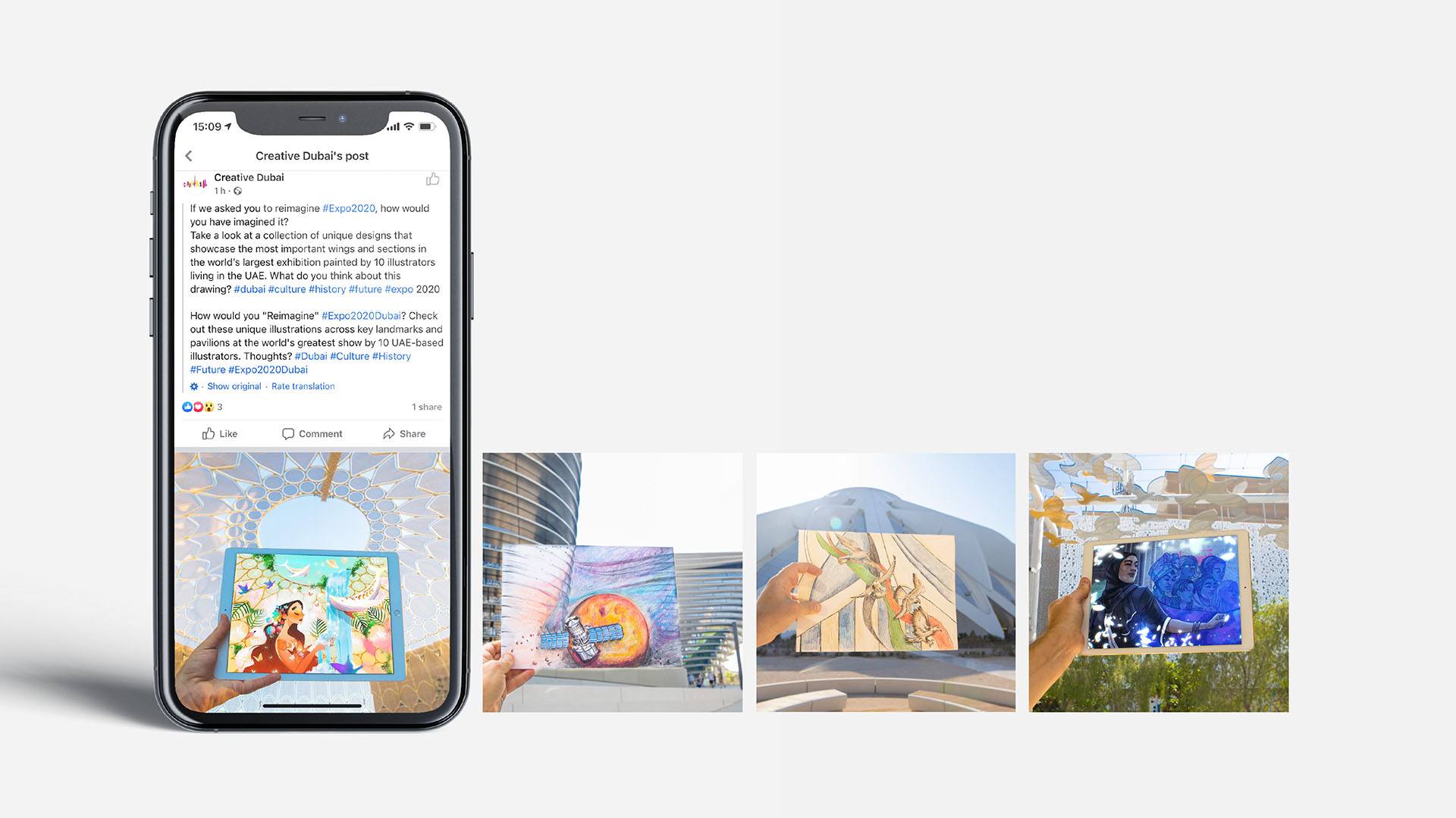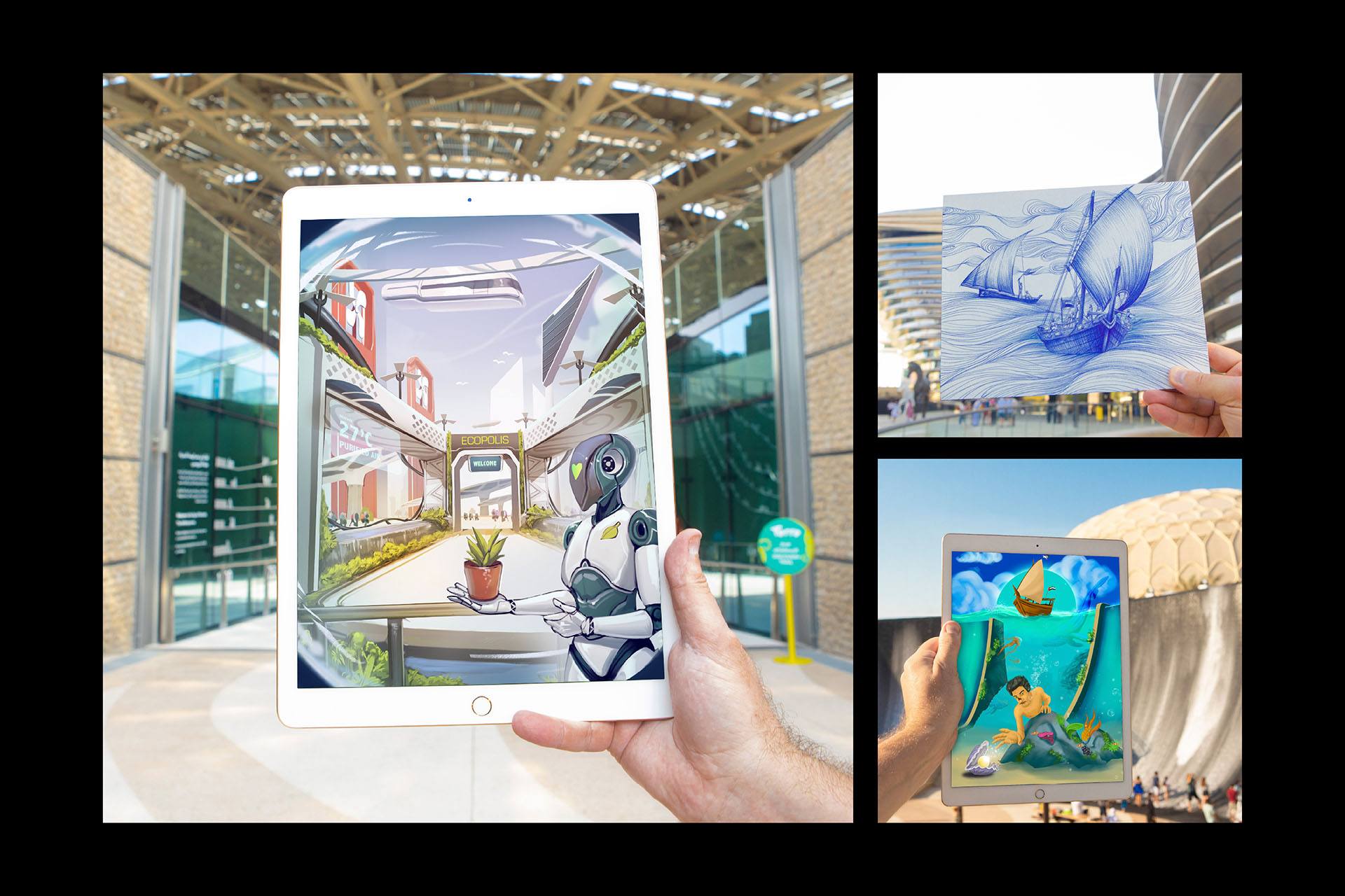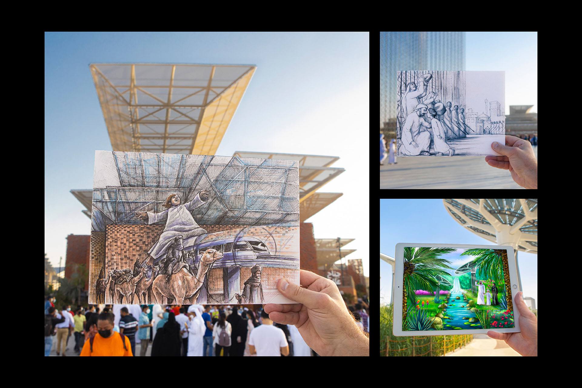 Through each photograph (where their artwork met the real-world location) we were able to link reality and imagination – tying in the Expo tagline of: Connecting Minds, Creating the Future.